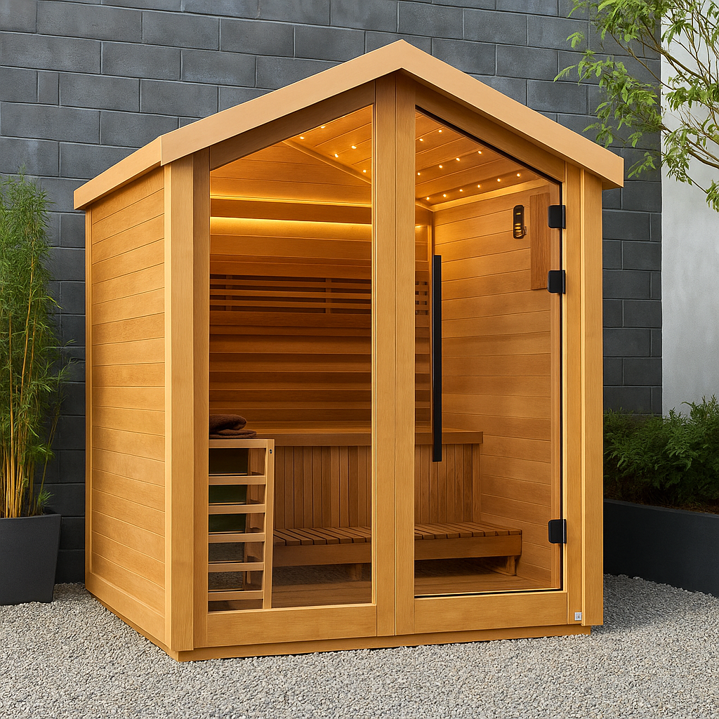 Enjoy a classic sauna experience with the Savonlinna, powered by an 8kW Harvia electric heater for consistent, even heat. Inside, ambient Galaxy Star lighting and rear accent lights create a calming atmosphere. Built-in Bluetooth, FM radio, and high-quality speakers let you relax with your favorite music or podcasts.